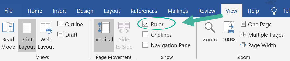 Porniți rigla făcând clic pe View și bifați caseta de selectare pentru a indica rigla