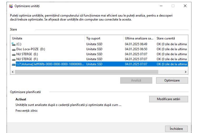 Volum{…}” din Instrumentul de optimizare a discului, aceasta este o partiție rezervată Microsoft (MSR). MSR este utilizat pentru a sprijini tabelul de partiționare GPT a sistemului UEFI. Nu o veți putea șterge și nu trebuie să o defragmentați sau să o optimizați, lăsați totul așa cum este.