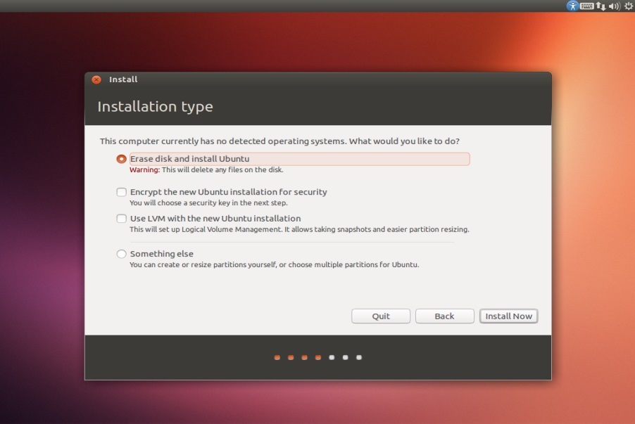 Puteti lasa tipul default (Erase disk and install Ubuntu).
