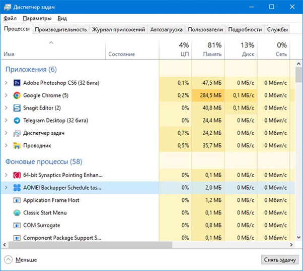 Pentru a evita scăderea FPS, utilizați instrumentul standard Windows „Manager de activități”. Pe un PC care rulează Windows 10, apăsați „Win + X”. Selectați elementul corespunzător. În fila Procese, uitați-vă la ce folosește cel mai mult RAM. Închideți procesele care nu sunt în uz în prezent selectând Terminați sarcina pentru fiecare.
