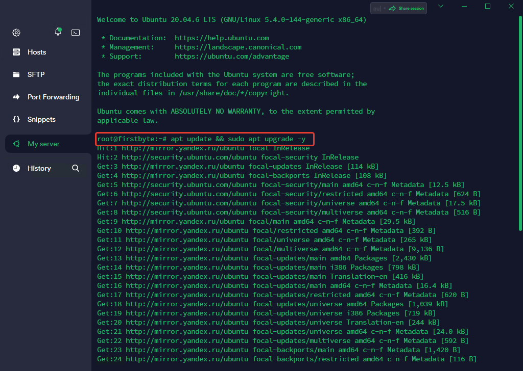 Ne conectăm la server și căutăm cele mai recente pachete disponibile pentru aplicațiile noastre. Pentru a face acest lucru, executați comanda:apt update && apt upgrade -y