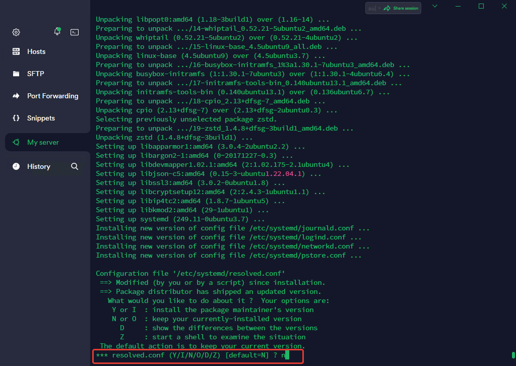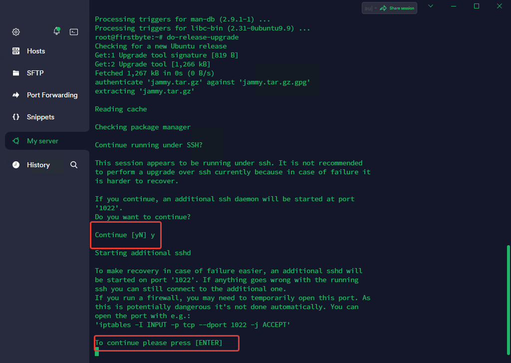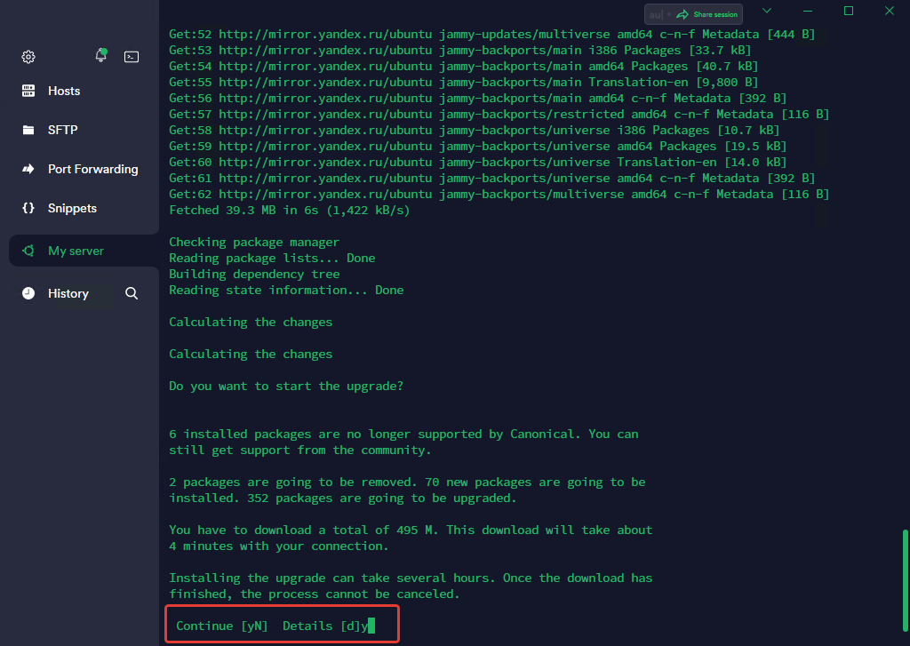 Vedem că sistemul de operare a găsit actualizarea și scrie „y”, apoi apăsați Enter. Sistemul de operare ne-a anunțat că va deschide un port SSH suplimentar pentru ca în timpul procesului de actualizare să nu ne deconectăm de la server. Apoi confirmați și apăsați Enter
