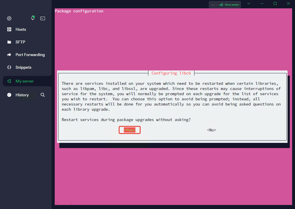 Unele servicii vor trebui repornite după actualizarea unor biblioteci și pachete. În această fereastră pop-up, selectați Da pentru a reporni aceste servicii în timpul actualizării pachetului fără a fi solicitat.