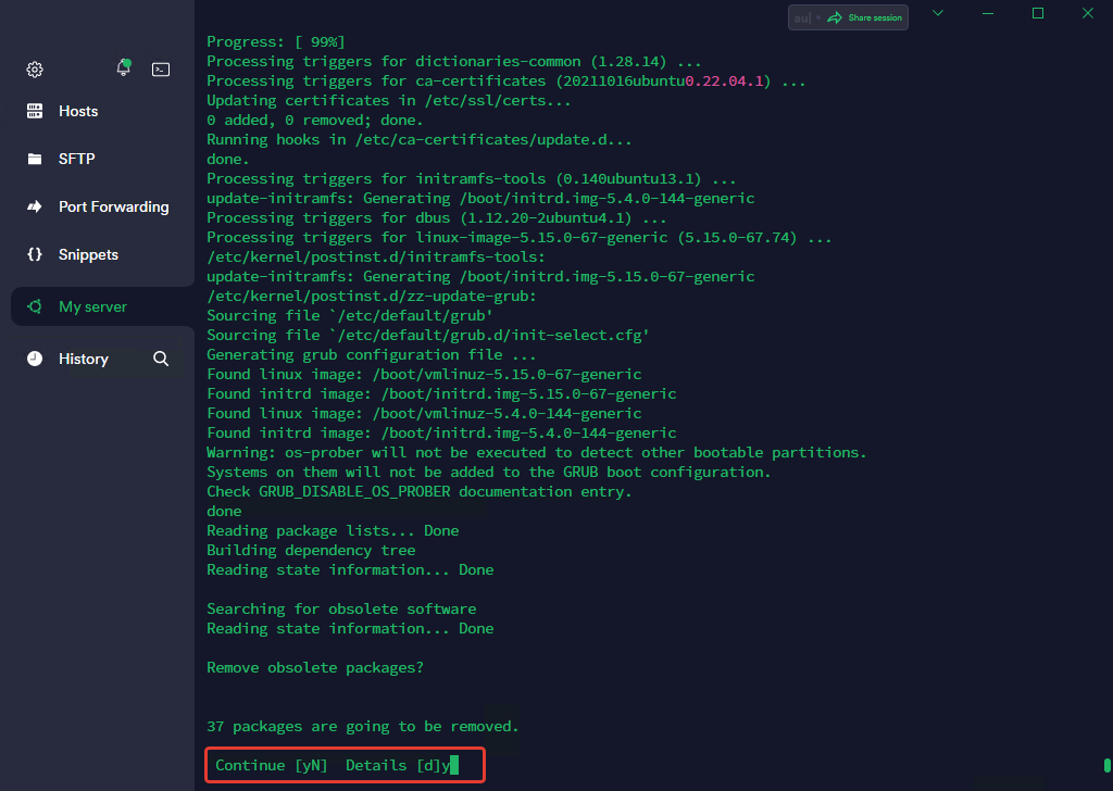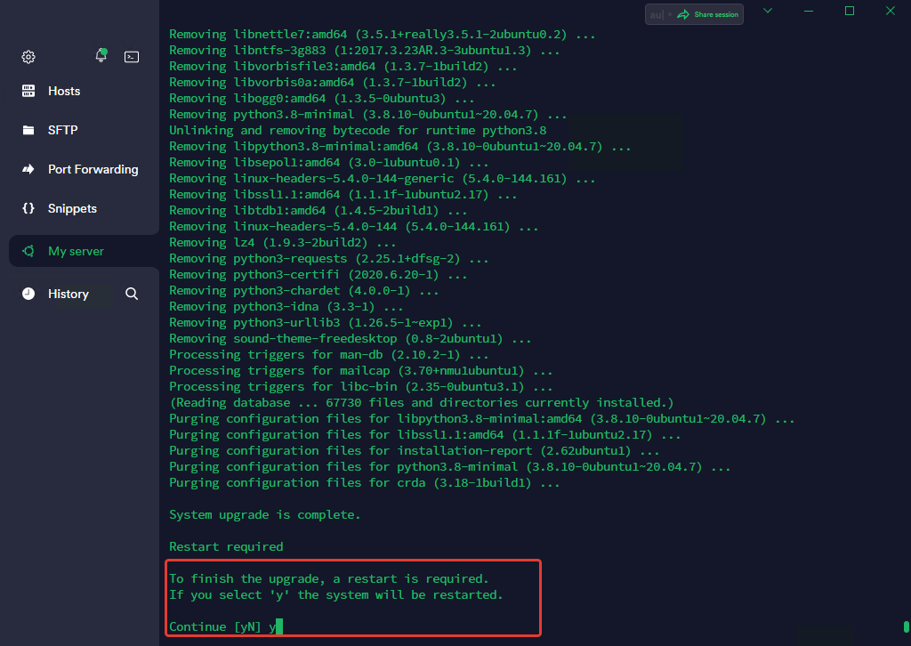 Acum scriem litera „y” și repornim serverul, astfel încât procesul de actualizare să fie finalizat.