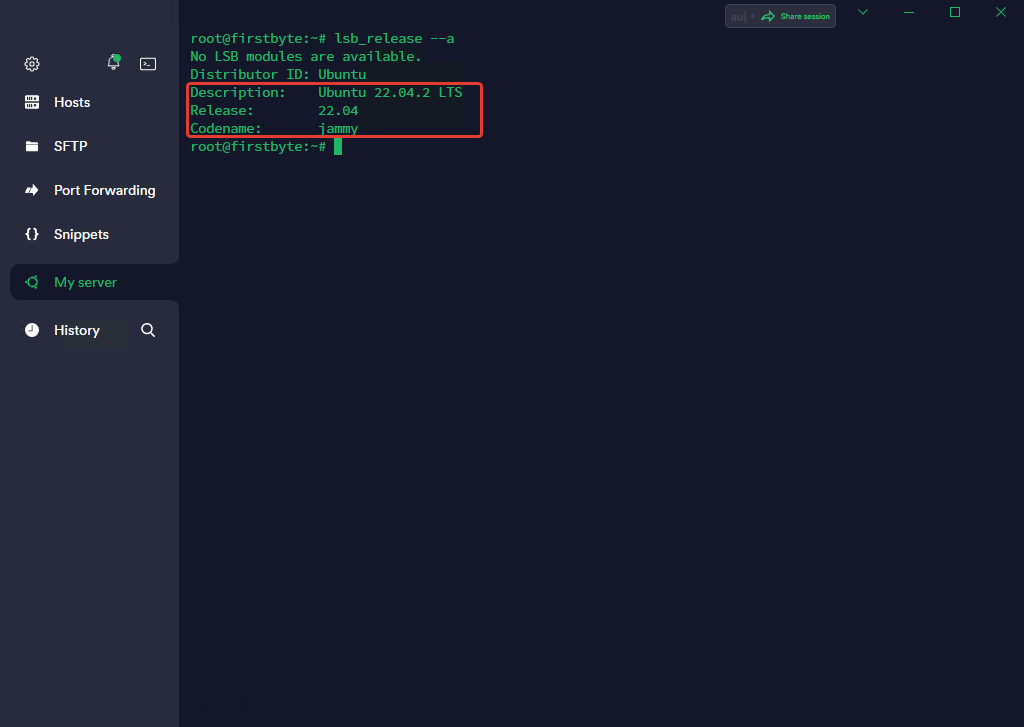 Ne logăm din nou la serverul nostru după un minut și executăm comanda pentru a vedea dacă sistemul nostru de operare a fost actualizatlsb_relase --a