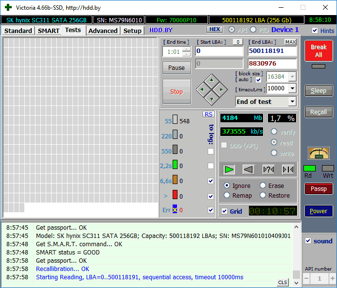 Instrucțiunile pentru utilizarea Victoria vor dura mai mult de o pagină și, prin urmare, nu mă angajez să le scriu acum. Permiteți-mi doar să spun că elementul principal al programului în versiunea Windows este fila Tests. Începând testarea și selectând mai întâi hard disk-ul din prima filă, puteți obține o reprezentare vizuală a stării sectoarelor hard diskului. Observ că dreptunghiurile verzi și portocalii cu un timp de acces de 200-600 ms sunt deja proaste și înseamnă că sectoarele se defectează (doar HDD-urile pot fi verificate în acest fel; acest tip de verificare nu este potrivit pentru SSD-uri).