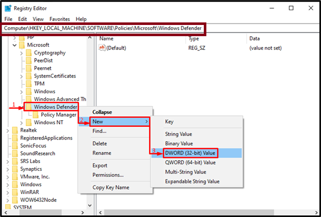 - Navigați la: HKEY_LOCAL_MACHINE\SOFTWARE\Policies\Microsoft\Windows Defender.