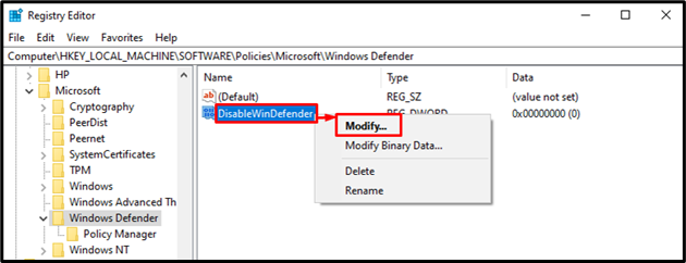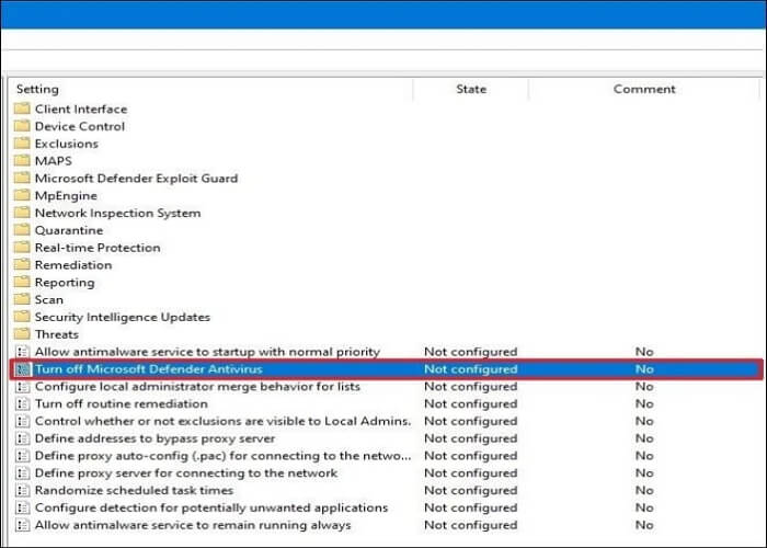 - Găsiți opțiunea „Turn Off Windows Defender Antivirus” și activați-o pentru a dezactiva complet protecția încorporată.