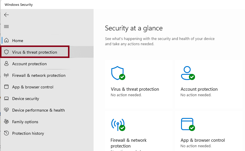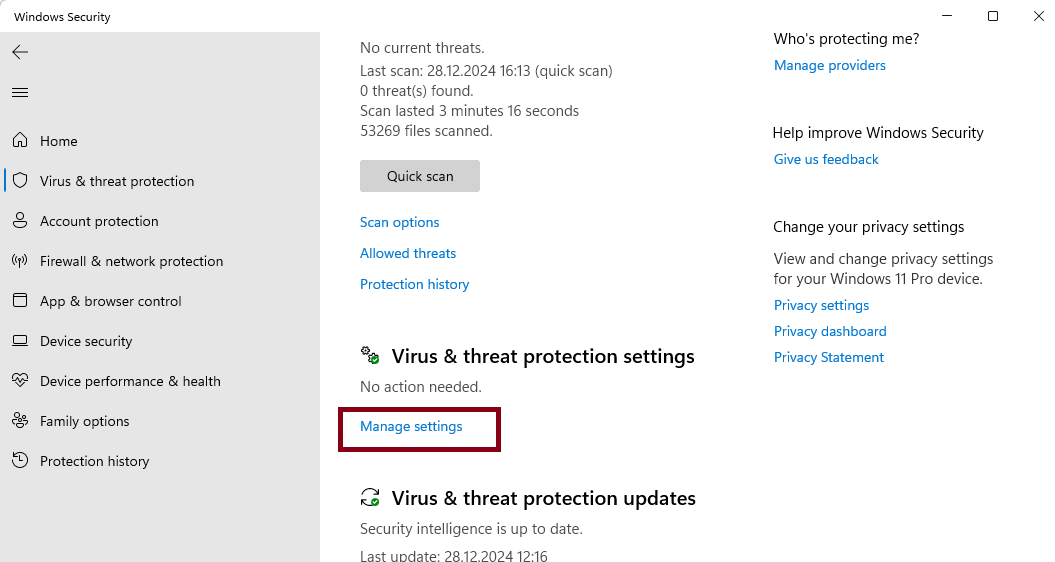 - Sub Protecție antivirus și amenințări, selectați Gestionați setările.