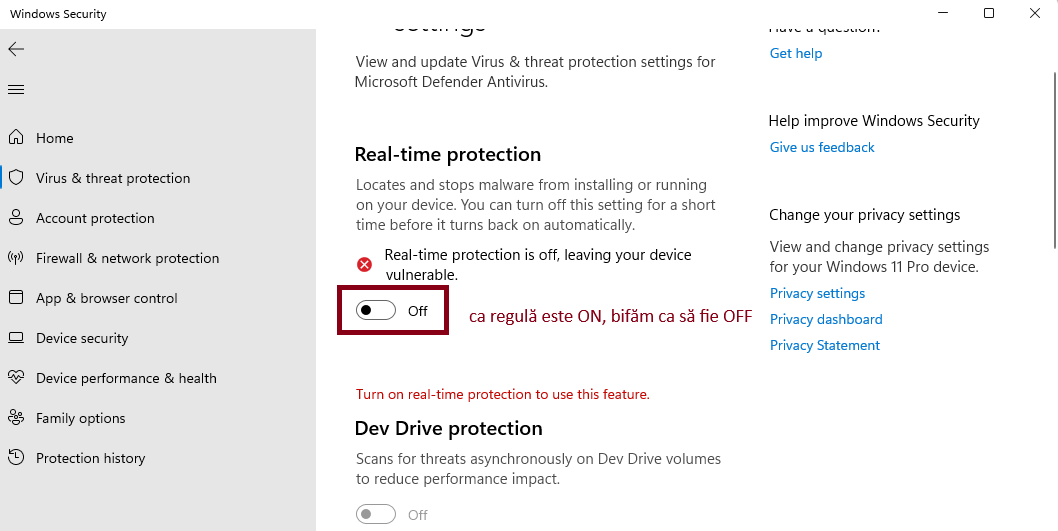 - Dezactivați opțiunea Protecție în timp real prin glisarea comutatorului. Acest lucru va dezactiva temporar antivirusul, dar sistemul îl poate activa automat după un timp.