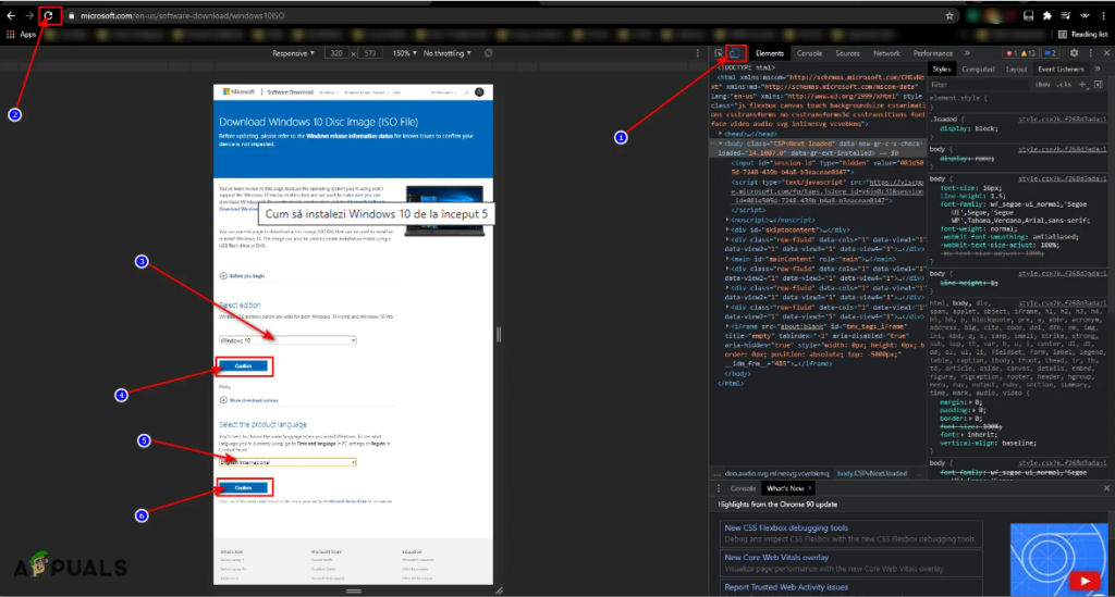 Apasă pe opțiunea de Mobil și dă un refresh la site pentru a încărca site-ul în versiunea pentru telefon și descarcă Windows-ul conform indicațiilor din imaginea de mai jos.