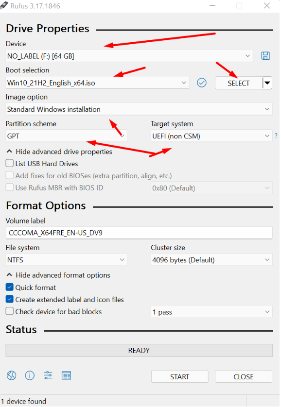 Alege GPT la partition scheme pentru UEFI și verifică opțiunile din imaginea de mai jos să fie alese după care apasă START.
