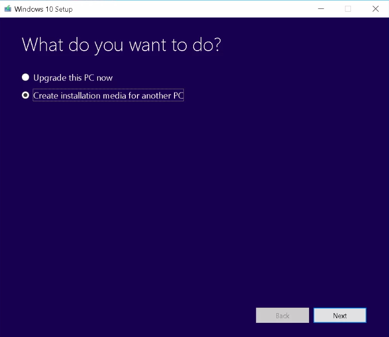 - Selectează opțiunea Create installation media for another PC și apasă Next.