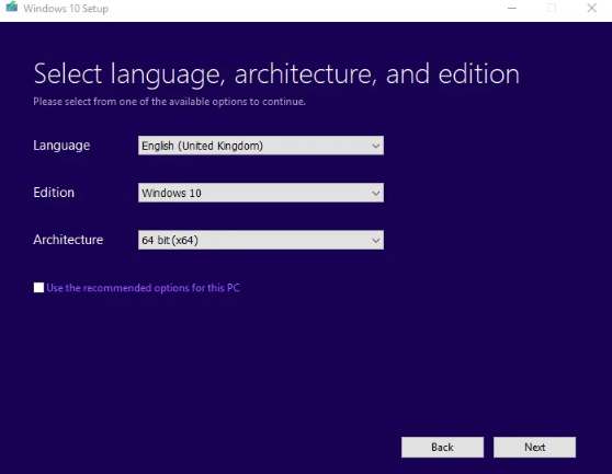 5. Alege limba, ediția (Windows 10 Pro) și arhitectura (dacă procesorul tău are arhitectura 65 bit, alege 64 bit, daca are 32 alege 32, dacă nu știi ce arhitectură are procesorul dispozitivului tău,