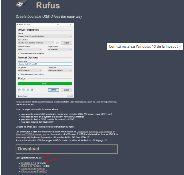 Descarcă aplicația Rufus de la https://rufus.ie/en/– atenție, descărcați ultima versiune disponibilă.