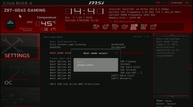Deoarece fiecare producător are un aspect BIOS diferit, nu vă pot spune unde este exact setarea UEFI. Vă sugerez să consultați manualul sau să întrebați pe forumurile OCC. Pentru placa de bază MSI pe care am folosit-o pentru acest ghid, setarea era în meniul Boot și, implicit, avea UEFI activat.