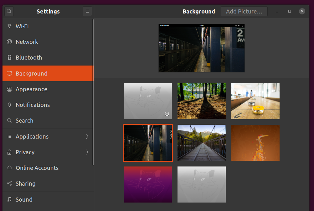 Puteți vizualiza imaginea de fundal implicită Ubuntu făcând clic pe Meniu → Setări → Fundal. Dar devin repede plictisitoare și vrei ceva nou. Puteți căuta manual imagini de fundal pe tot internetul sau puteți instala Variety.