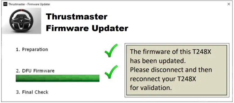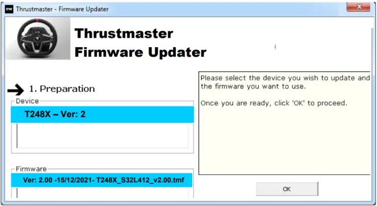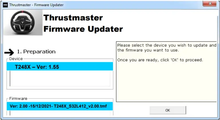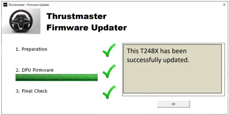 Faceți clic pe OK pentru a reveni la fereastra principală a programului de actualizare, apoi faceți clic pe THRUSTMASTER T248 Racing Wheel and Magnetic Pedal-12 pentru a ieși din program.