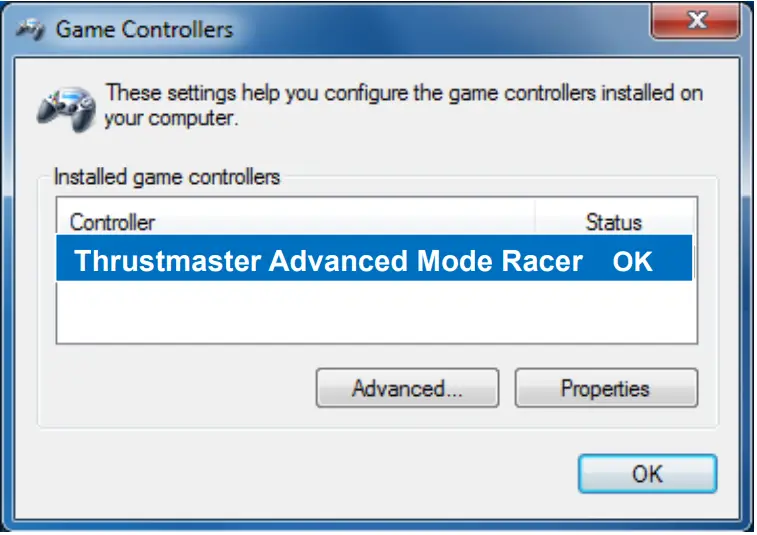 - În Start > Toate programele > Thrustmaster > FFB Racing Wheel > Control Panel, asigurați-vă că roata dvs. este listată ca „Thrustmaster Advanced Mode Racer”.