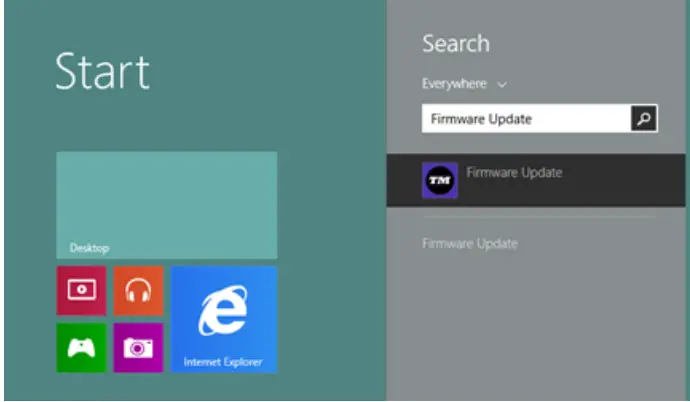 În meniul Start, începeți să tastați cuvintele „Actualizare firmware”. Aceasta va afișa funcția de căutare, oferindu-vă acces la aplicația de firmware: