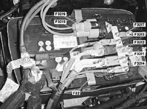 Siguranță de alimentare circuit 30, releu de alimentare de la producătorul caroseriei, radio, afișaj, claxon, conector de diagnosticare, comutator lumini de frână, releu electric al oglinzii exterioare, monitorizarea presiunii în anvelope, ESP, indicator Run Flat (fără fir), senzor de ploaie/lumină, sursa producătorului caroseriei, Rele sistem A/C, releu servodirecție, iluminare interioară