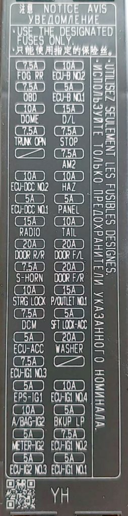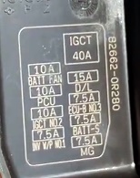 | ECU-IG1 NO.1 | Controlul stabilității vehiculului, Ventilatoare electrice de răcire, Dezaburire lunetă, Dezaburire oglinzi retrovizoare exterioare, Senzor la volan, Sistem de injecție de combustibil cu mai multe porturi/Sistem de injecție de combustibil cu mai multe porturi secvenţiale, Faruri (faza scurtă), Sistem de încărcare a bateriei, Monitor unghi mort |